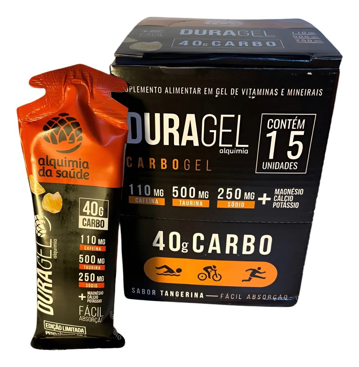 Caixa de Carbogel Duragel com 40g Carb + Cafeína Sabor Tangerina - 60g 15 unidades
