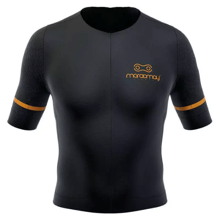 A modelagem Marcio May foi desenvolvida para proporcionar conforto e ao mesmo tempo alto rendimento e aerodinâmica. A parte das costas é em tecido Dry que permite ótima transpiração e nas laterais um tecido tipo tela auxilia na transpiração.